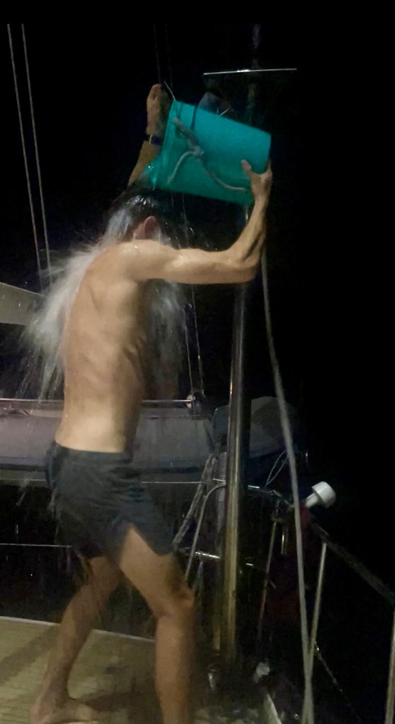 So he says we can take showers again! Haha I asked if we were starting to smell and we laughed and said of course that’s not it. Anyways, Steve and I both took showers on the stern with the wash down hose after the spinnaker work was done. There’s nothing like your first shower in over a week, I wasn’t expecting any during the crossing so this was a treat.