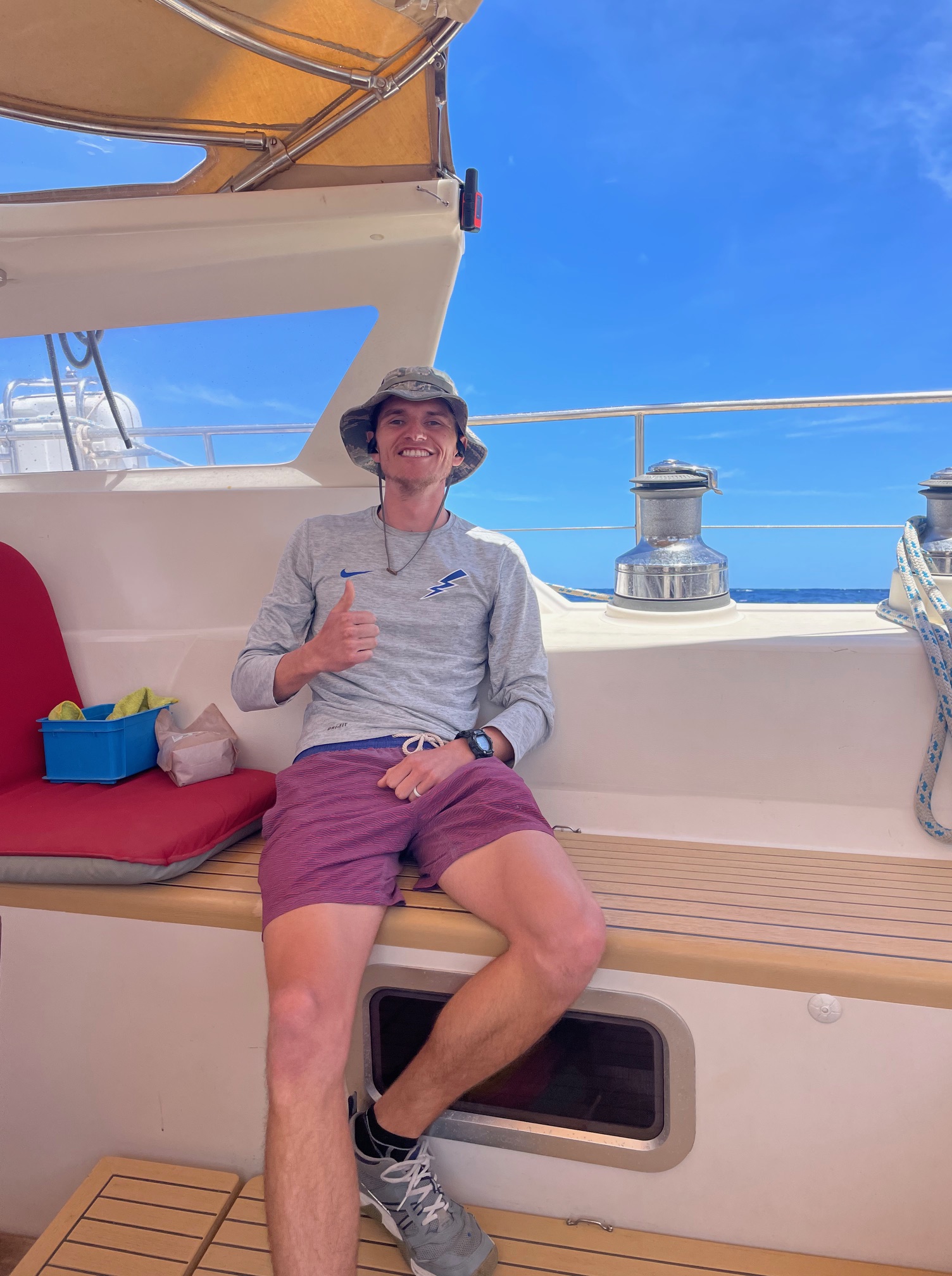 All that to say it took three of us on deck 2-3 hours and 3 different hoists to get it right and set. I was very glad to have Steve onboard who has a significant amount of foredeck experience on fast race boats. He was kind and throughout and did the hard work of sitting in the bow pulpit and making sure the sail fed right and didn’t drop into the water on more than one occasion, if it dodged go into the water we would’ve been in really bad luck. The Pacific Ocean is not the place to go shrimping with your spinnaker. I sat at the mast and winched the whole sail up, that alone took a while.